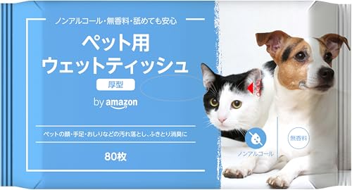 Amazonブランド「Wag」から販売されているペット用ウェットティッシュは、ノンアルコール・無香料タイプで安心して使える厚手仕様が特徴です。