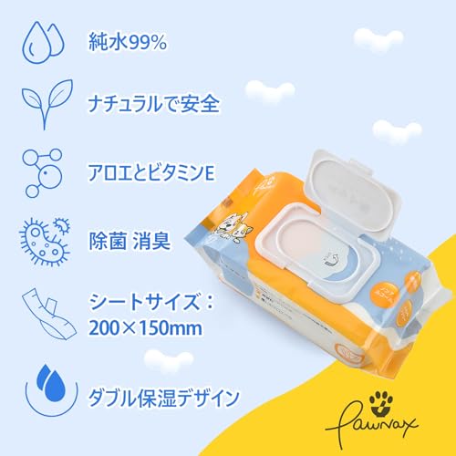 Pawnaxのペット用ウェットティッシュは、純水99%をベースに天然成分を配合した低刺激タイプのウェットシートです。