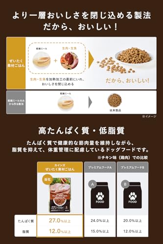 - 犬本来の食生活に近いレシピ:動物性たんぱく質を中心に、ビタミン・ミネラル・必須脂肪酸をバランス良く配合。自然に近い栄養補給を実現。